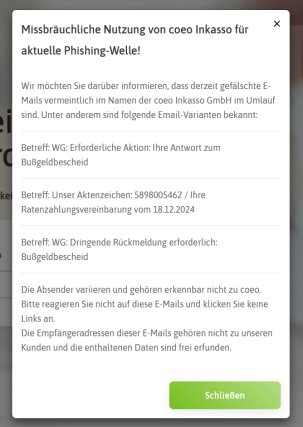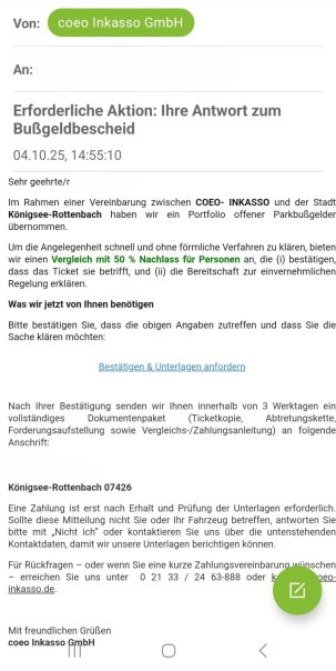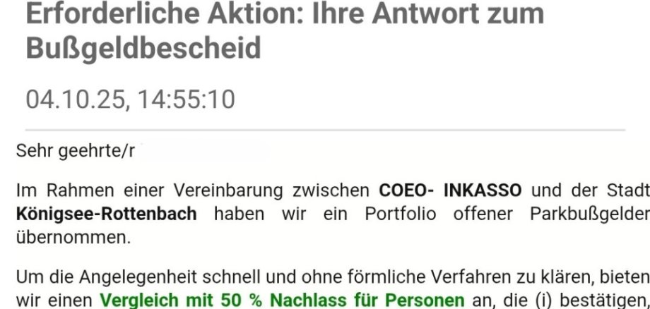 Wir wurden heute darüber informiert, dass derzeit E-Mails im Umlauf sind, die Sie zur Eingabe Ihrer Daten in einem angeblichen Verkehrsordnungswidrigkeitenverfahren auffordern (siehe Foto 1). Laut der E-Mail habe die Stadt Königsee-Rottenbach mit der Firma CEOE Inkasso GmbH eine Vereinbarung zur Übernahme offener Parkbußgelder geschlossen. Dies entspricht nicht der Wahrheit. Es existiert keine solche Vereinbarung zwischen der Stadt Königsee (oder Königsee-Rottenbach) und der Firma CEOE Inkasso GmbH. Nach Rücksprache mit einer Mitarbeiterin der Firma CEOE Inkasso GmbH wurde uns mitgeteilt, dass aktuell vermehrt solche sogenannten Phishing-Mails im Umlauf sind, deren Absender jedoch nicht die Firma CEOE Inkasso GmbH ist, auch wenn es auf den ersten Blick den Anschein hat. Auf deren Homepage wurde auch bereits eine entsprechende Warnung veröffentlicht (siehe Foto 2).