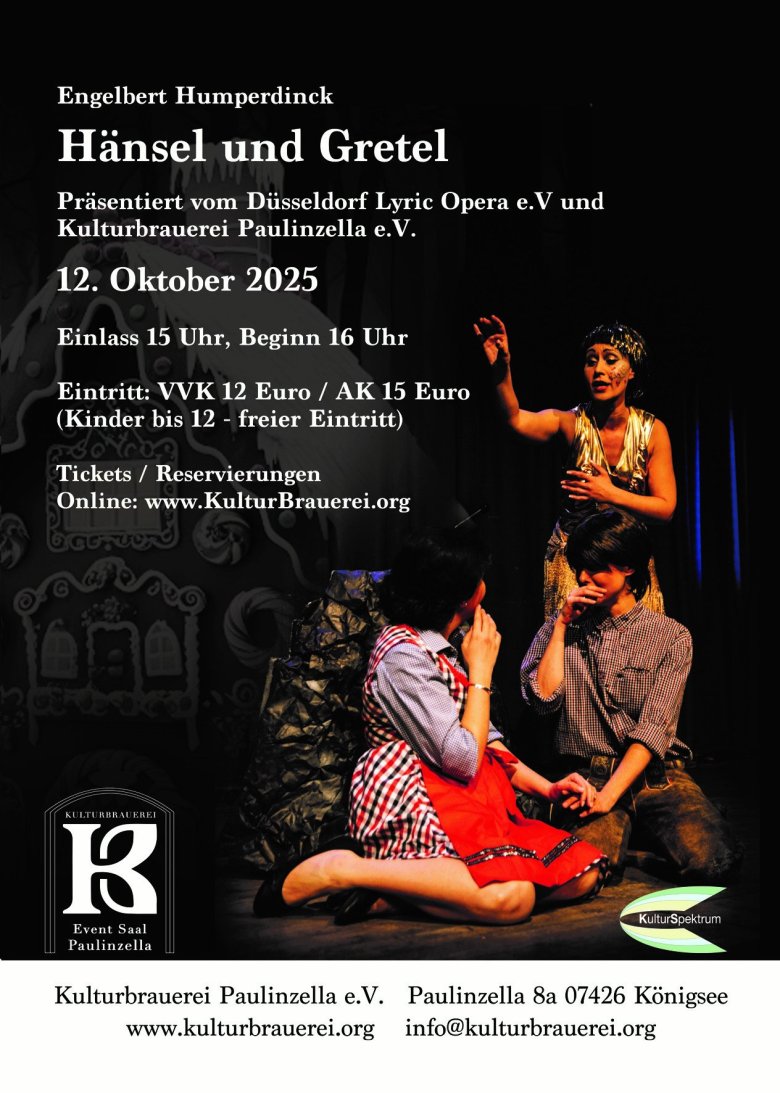 Stephanie Woodling (Hänsel, Mezzosopran) und Ekaterina Somicheva (Gretel, Sopran) erwecken die abenteuerlustigen Geschwister zum Leben, die sich der herrlich boshaften Hexe stellen, gespielt von Tiina Enckelmann (Mezzosopran), deren unheimliches Kichern und bunte, bonbonfarbene Roben mit schelmischem Humor die Bühne erobern. Die Eltern, Gertrud (Claire Lumsden, Sopran) und Peter (Seamus MacCallum, Bariton), vervollständigen die Besetzung, während der Kinderchor der Kulturbraurei Paulinzella, bestehend aus einheimischen Kindern unter der Leitung von Christine Fichtner und Rebekka Buck, für herzerwärmenden Charme sorgt. Diese fantasievolle Inszenierung, begleitet vom Pianisten und Dirigenten Ville Enckelmann, verwandelt Paulinzella in ein magisches Wunderland.