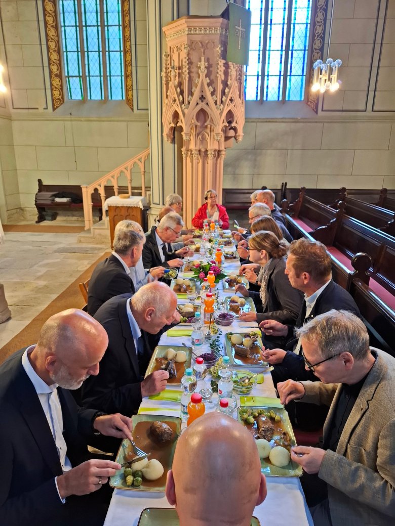 Nun schon erprobt, waren wir ganz souverän in unserem Programm: Vorträge Erika Lichtenheld, Anne-Sophie Bunk, Orgelführung und Orgelspiel. Aber wir wären keine echten Königseer, würden wir uns nicht noch etwas Besonderes einfallen lassen. Gemeindekirchenrat und Orgelschatz- Teammitglied Jörg Müller organisierte ein Mittagessen der guten Thüringer Küche vom Gasthaus Kemter aus Dröbischau. Und so wurden, vermutlich zu ersten Mal, Thüringer Klöße, Rouladen und Rotkraut in der Königseer Kirche serviert. Besondere Umstände erfordern eben manchmal auch besondere Maßnahmen.