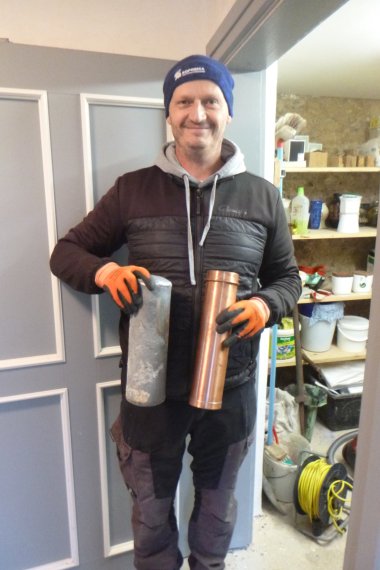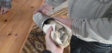 Die Zink-Kapsel von der letzten Eröffnung des Turmknopfes 1982 wurde im Kreise interessierter Anwohner geöffnet, gesichtet und wieder verschlossen. Eine neue Hülse mit aktuellen Zeitzeugnissen kam hinzu.