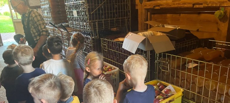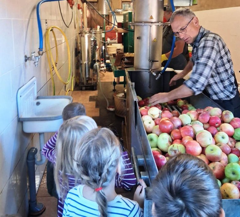 Vor Ort konnten die Kinder hautnah miterleben, wie aus frischen Äpfeln Saft entsteht – vom Waschen über das Pressen bis hin zum Abfüllen.