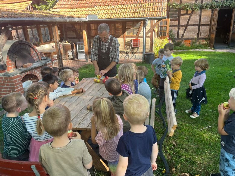 Ein besonderer Dank gebührt den Mitarbeitern des KulturNaturHofes in Bechstedt, den Eltern und Großeltern für die Apfelspenden und natürlich den Erzieherinnen für den schönen Ausflug!